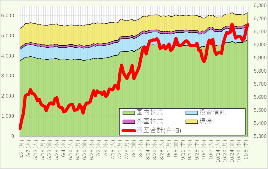 このところの下落にもかかわらず、評価額は61,000万以上をキープしています。下がるとゲンナリしますが、年末の賞与と給与支給、配当金を受け取って、年が明けてNISA分の仕入れをする時にある程度相場が低迷していれば自信を持って前倒しの買いが入れられます。実際には360万のうち半分ぐらいを先に買い付けるぐらいだと思いますが、ありですね。日経平均4.5~4.7万までの調整の心の準備をしておきます。