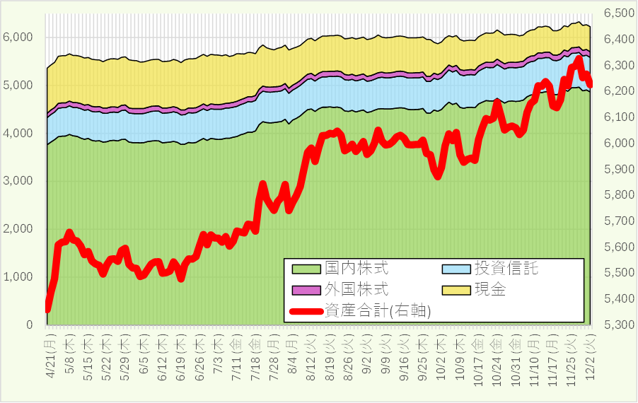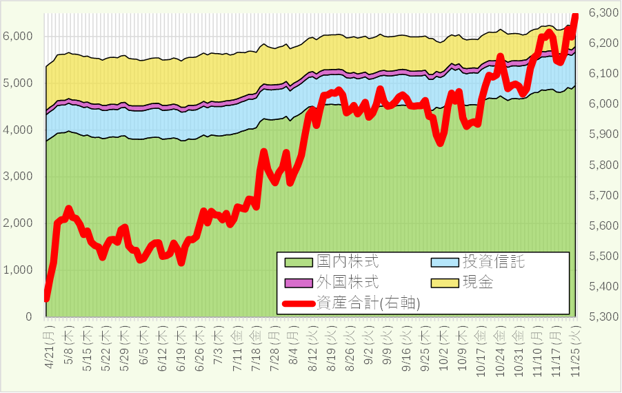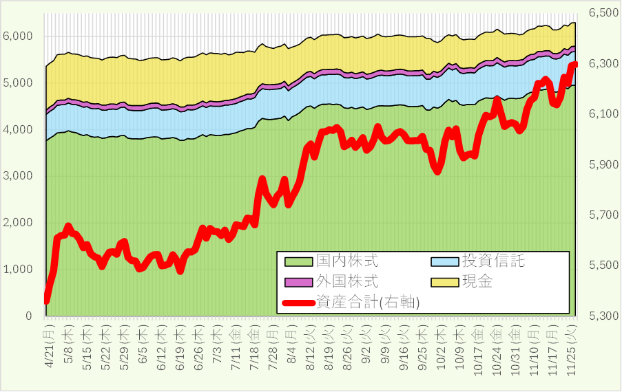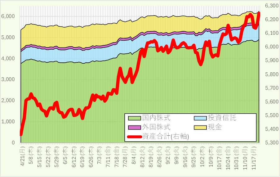 私の評価額は最高額を更新しました。国内株式、投資信託が最高額更新ですが、これはちょこちょこ買い増ししているからと言う要素はあると思います。とは言え、9月末からは入金を止めているので、評価額上昇してます。週明けには給料日がやってきますが、目標の6200万を超えているので入金無しで進もうと思います。